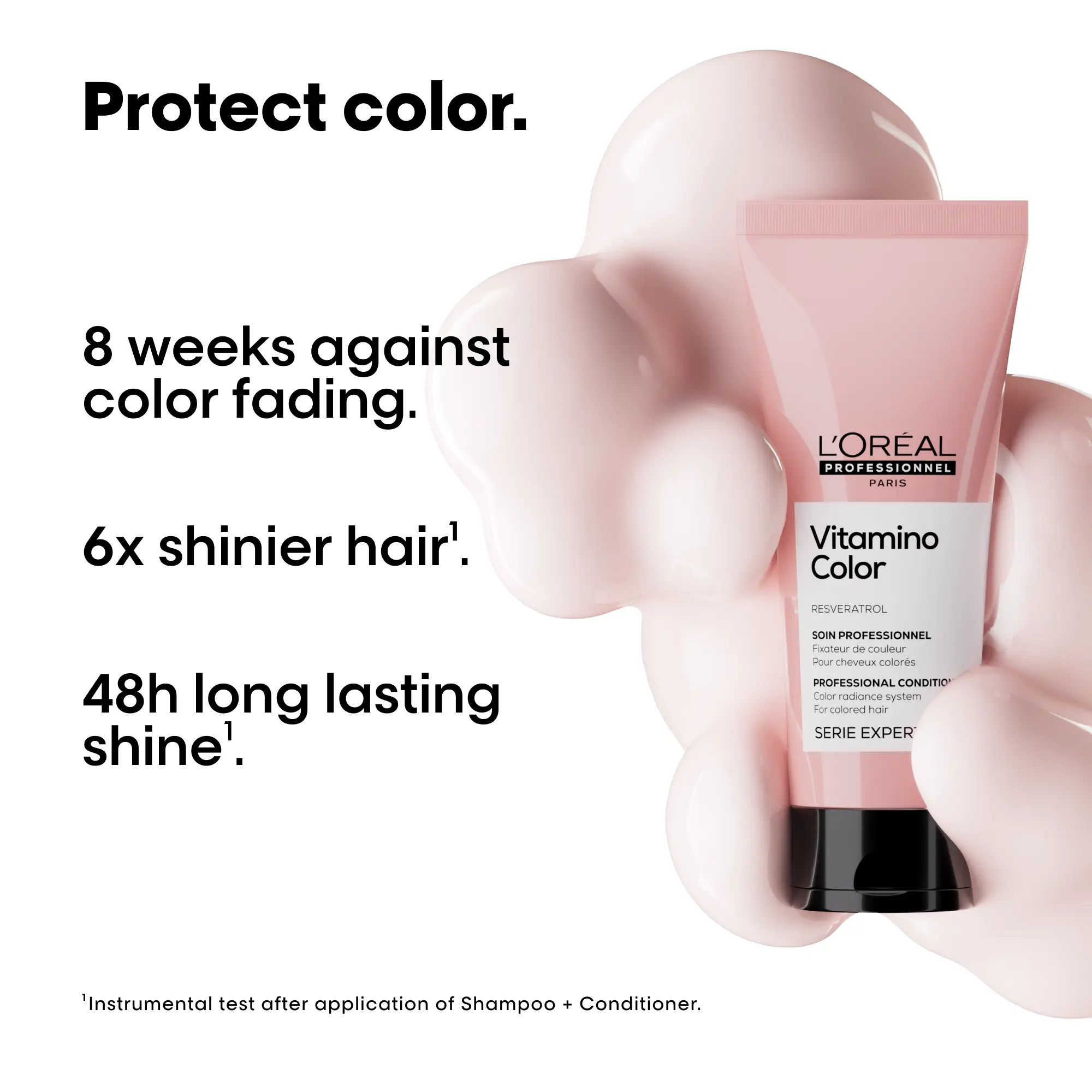 Vitamino Color Conditioner 200ml – L’Oréal Professionnel Vitamino Color Conditioner nourishes colour-treated hair, allowing colour to last up to 8 weeks. Coloured hair is up to 6 times shinier, appears brighter and more radiant. Hair feels lighter, manageable and soft. Formula enriched with resveratrol, a powerful anti-oxidant for perfect salon coloured hair.